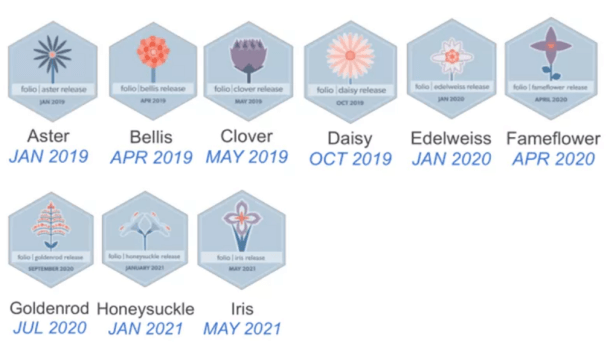 按照FOLIO社区路线图规划,命名的产品发布每年三期。每个版本以一种花的名称来进行命名,按照A-Z的顺序进行发布。自2019年Aster版本发布以来,Juniper版本是社区发布的第10个版本。历史各发布版本名称如下: