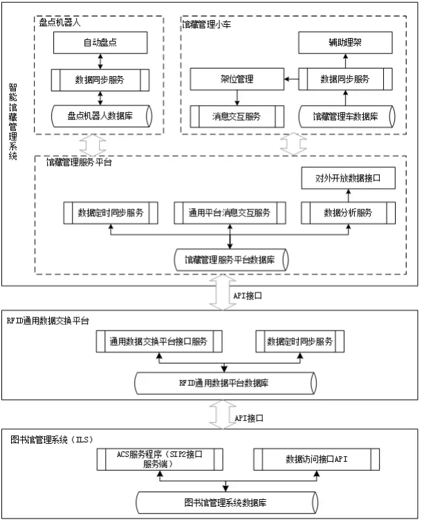 交大图书馆主动创新,从2018年开始历时三年,完成了机器人智能盘点以及配套的馆藏管理系统的开发。RFID技术应用于高校图书馆初期,交大馆代表“高校图书馆RFID技术应用联盟”,推出了RFID通用数据规范,搭建了RFID通用数据交换平台,平台对接图书馆管理系统。智能馆藏管理系统对接通用数据交换平台,遵循数据交换规范,盘点机器人和馆藏管理小车对接馆藏管理服务平台进行数据同步和消息交互。系统实现框架如下图。