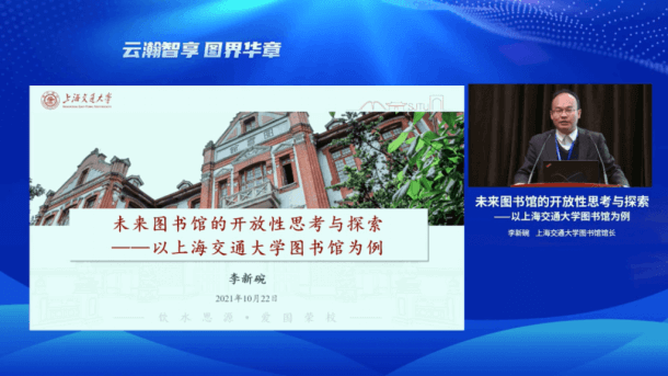 上海交通大学图书馆馆长李新碗的报告题目为《未来图书馆的开放性思考与探索——以上海交通大学图书馆为例》。李新碗馆长介绍了图书馆开放性的发展现状,并基于上海交通大学图书馆,谈了对未来图书馆开放性的思考。