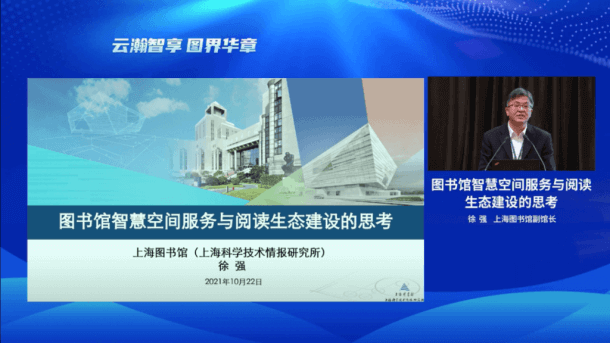 上海图书馆副馆长徐强的报告题目为《图书馆智慧空间服务与阅读生态建设的思考》。徐强副馆长结合上海图书馆东馆建设,分享了对图书馆智慧空间服务、阅读生态建设、以及新一代图书馆构架的思考。