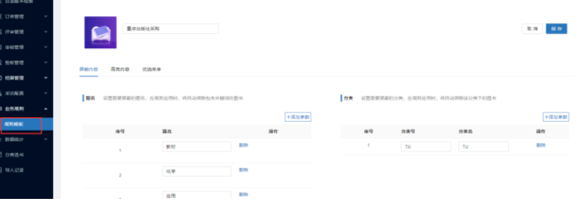 在“业务规则”菜单下,平台提供规则模板设置,可设置屏蔽项、高亮项、优先排序项等内容,可以对题名、作者、出版社、中图分类、定价等多项内容进行前置设置并生成规则模板,在选定书目后,在批次中应用规则,即可便捷的筛选书目。