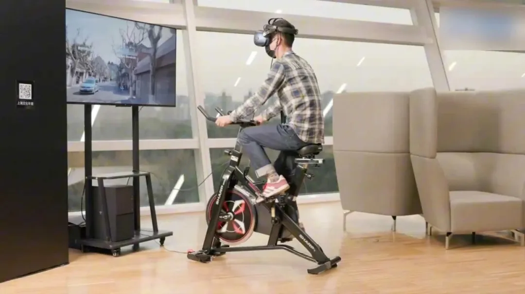 其中,2020年一等奖作品成果落地为“红色VR骑行”项目,观展者在此次展览的互动区就能体验。该系统利用虚拟现实技术与室内骑行设备,将上海12条红色路线、沿途建筑与历史故事以沉浸式方式呈现,让观众在骑行速度的变化中“穿行”于城市的红色记忆,边运动边了解建筑背景,在虚拟空间中完成一场连接数据与文化的体验,在互动中“骑行”城市历史。
