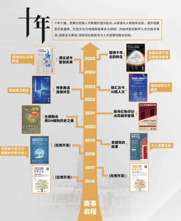 回望这十年,开放数据竞赛不仅是技术与创意的舞台,也是许多读者、学生、研究者第一次走进历史人文数据世界的入口。从解读一份家谱,到复原一段城市记忆;从用代码描绘古籍关联,到用AI生成新的文化表达——每一届竞赛都留下了独有的时代印记,也让越来越多的人看到数据背后蕴藏的故事与可能性。