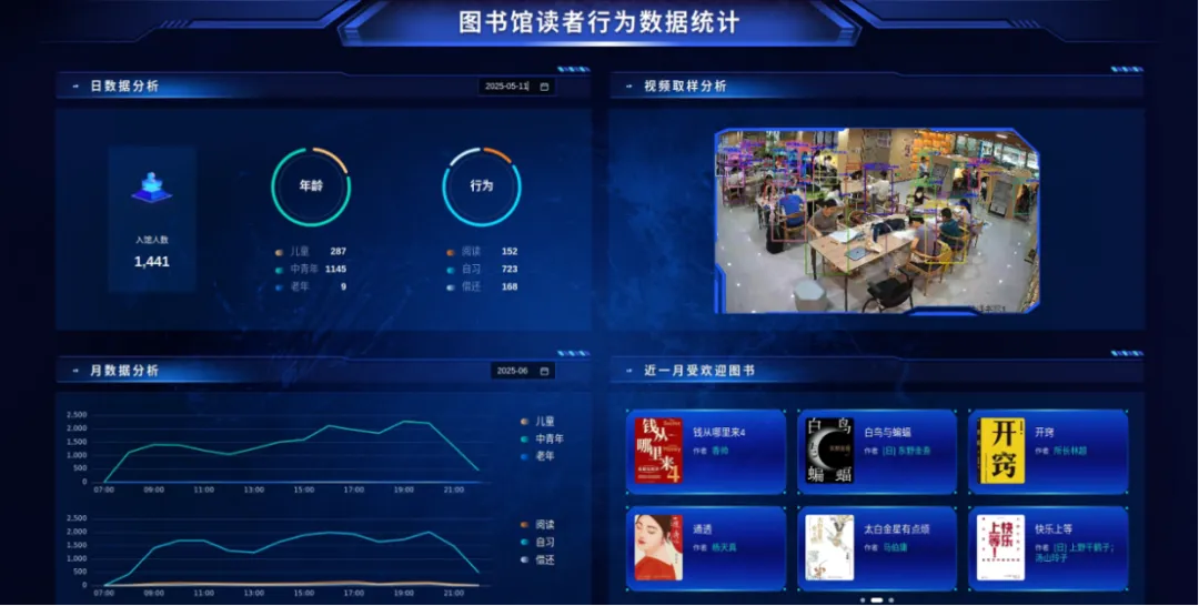 AI慧眼项目主要是利用AI视觉与大数据分析技术,通过基层图书馆内监控摄像头收集监控视频,利用大数据模型分析读者行为数据,挖掘读者在馆内的行为特征、偏好区域与流动规律,形成一个“读者-空间”的关联矩阵,并设置不同的数值记录读者与该区域互动时的交互强度,如停留时间、姿态动作等,从而实现空间布局优化、服务内容升级和用户体验提升。目前项目在福田区香安社区图书馆试点部署运行,通过每日统计分析不同时间段到馆读者群体、主要行为动作等数据,对馆内图书进行精准调拨与馆藏优化,将儿童绘本和低幼读物集中配置到高使用率区域,同时对原本利用率较低的空间进行功能调整,增设座位改造为自习区。经过一段时间观察后,读者在馆内停留时间延长,图书周转效率提高,空间使用更加均衡,有效提升了馆内服务精准度与整体用户体验。