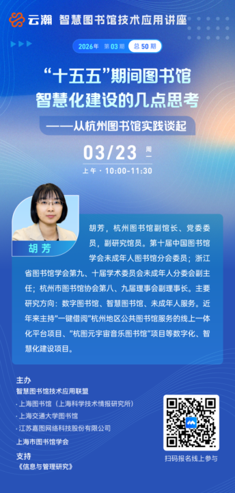 胡芳《“十五五”期间图书馆智慧化建设的几点思考——从杭州图书馆实践谈起》——“智慧图书馆技术应用讲座”2026年第3期(总第50期) 胡芳《“十五五”期间图书馆智慧化建设的几点思考——从杭州图书馆实践谈起》——“智慧图书馆技术应用讲座”2026年第3期(总第50期)