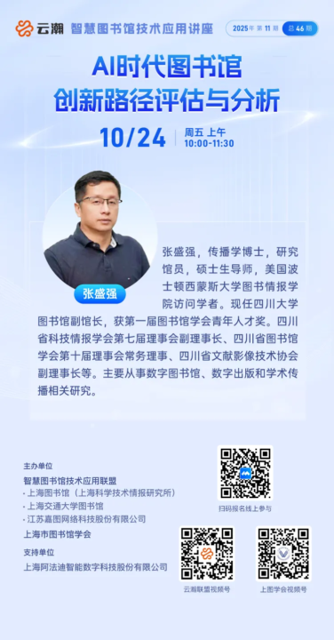 2025年第11期“智慧图书馆技术应用讲座”(总第46期)将于10月24日上午10点线上举办。本期讲座邀请到四川大学馆副馆长张盛强,带来题为《AI时代图书馆创新路径评估于分析》的精彩讲座。